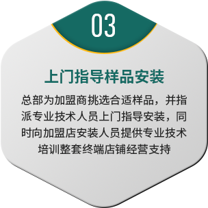 总部为加盟商挑选合适样品,并指派专业技术人员上门指导安装,同时向加盟店安装人员提供专业技术培训整套终端店铺经营支持